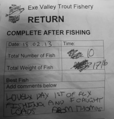 exe-valley-return-180213 Next Published February 20, 2013 at 400 × 416 in A Letter from Exmoor: Half Term Fly Fishing Makes my day to get a return like this made by an 11 year old angler earlier this week Discover more from Exmoor 4 all Subscribe to get the latest posts sent to your email. Type your email… Subscribe Share this: Click to share on X (Opens in new window) X Click to share on Facebook (Opens in new window) Facebook Click to share on Pinterest (Opens in new window) Pinterest Click to email a link to a friend (Opens in new window) Email Click to print (Opens in new window) Print Click to share on WhatsApp (Opens in new window) WhatsApp More Click to share on Telegram (Opens in new window) Telegram Click to share on LinkedIn (Opens in new window) LinkedIn Click to share on Reddit (Opens in new window) Reddit Click to share on Pocket (Opens in new window) Pocket Click to share on Tumblr (Opens in new window) Tumblr Like Loading...