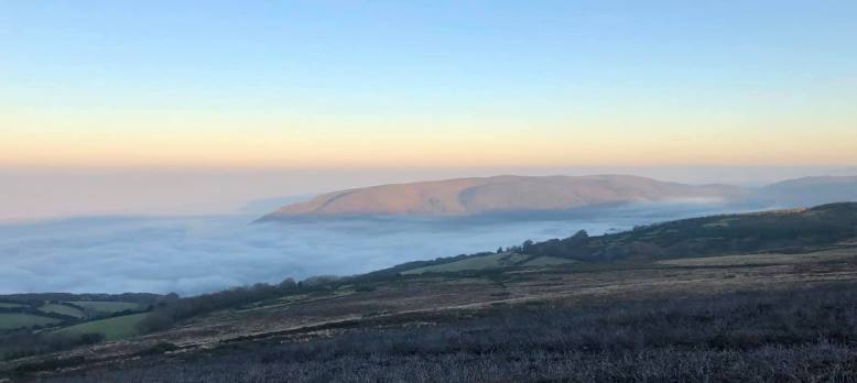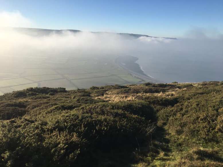 Looking through the clouds at Bossington & Porlock Weir from North Hill. Photo by Ken Broom.