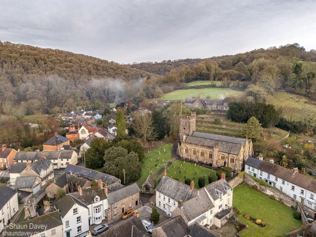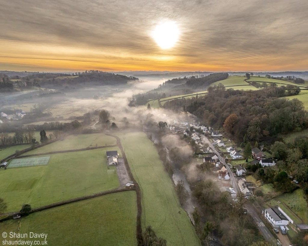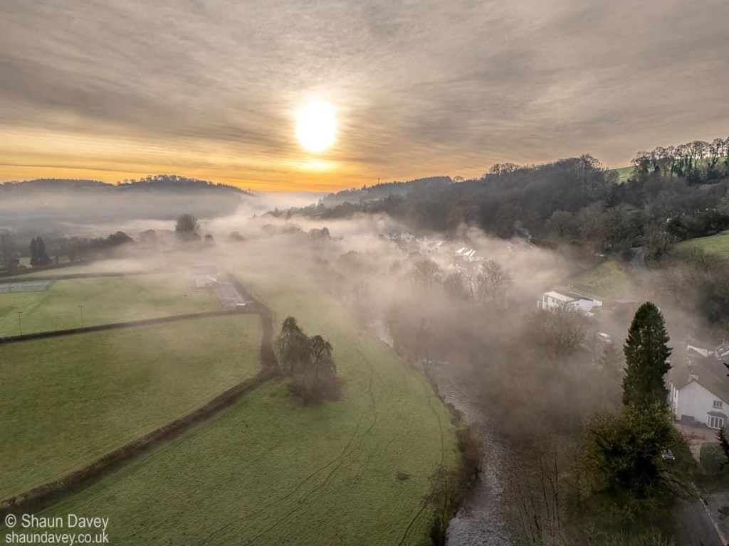 “Out on a secret mission this morning, I managed to pick up some collateral drone shots of Landacre and Dulverton emerging from the mist.”