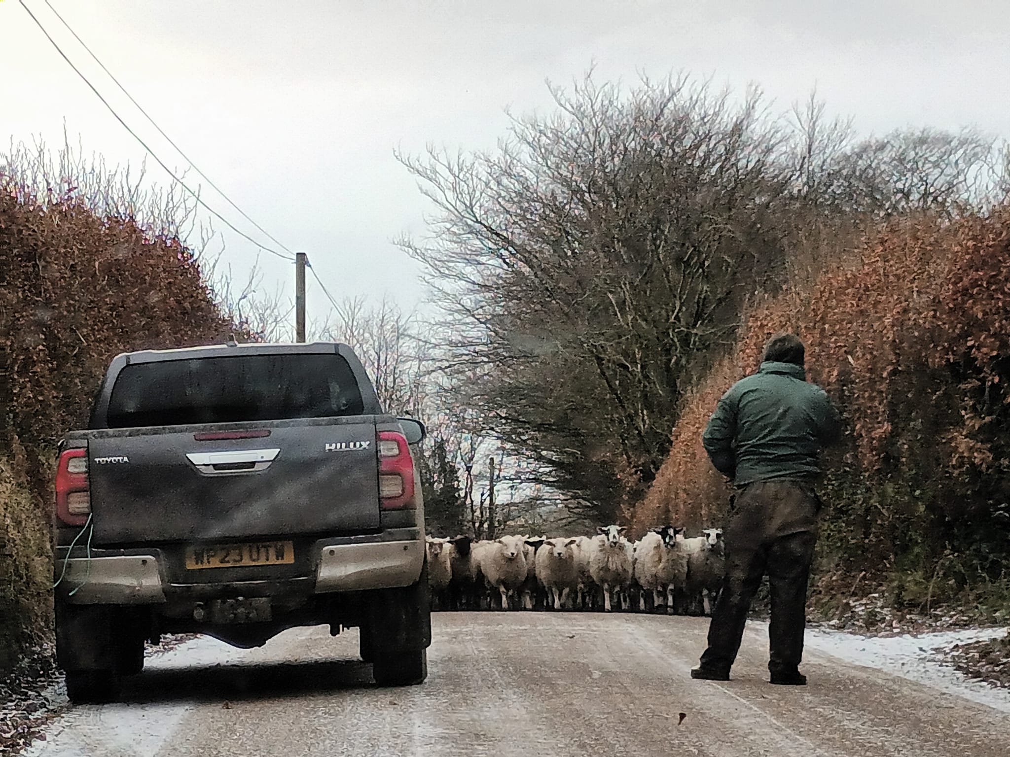 The river was a murky and tumultuous sight, with water surging well beyond the typically calm banks. Trees and shrubs lining the river’s edge were battered, with some even torn from their roots and carried downstream. Tarr Steps, a renowned prehistoric clapper bridge, was partially submerged, with only a few of its large stone slabs visible amid the rushing water. The storm’s force has shifted some of the stones. In the background, thick layers of grey clouds have obscured the surrounding hills, creating an even more ominous and foreboding atmosphere.