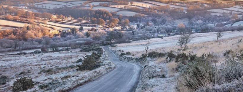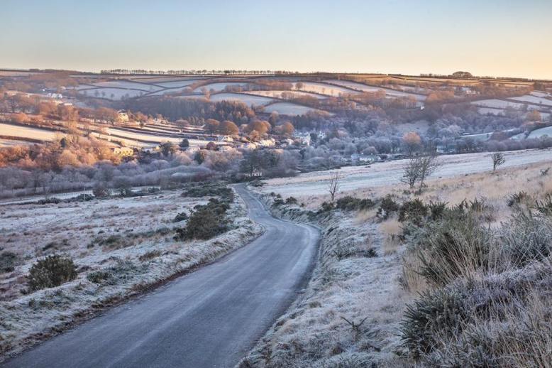 On a chilly winter’s morning deep in the valley a frosted village sits whilst the sun rays slowly rise at Withypool, Exmoor.